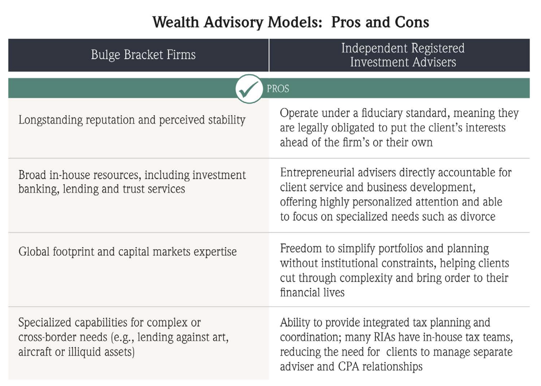 When a marriage ends, particularly one involving significant assets, clients face a flood of financial decisions and information. Choosing a new wealth adviser is one of the many important decisions an out-spouse must make to move forward successfully. This article provides an attorney-friendly framework for answering client questions about how advisers work, how they are compensated, and how to evaluate an adviser before hiring one. We also highlight trade-offs between large brand-name institutions and independent fiduciary firms, dispel common myths, and outline key questions clients should ask to ensure they find an adviser who is the right personal and professional fit.